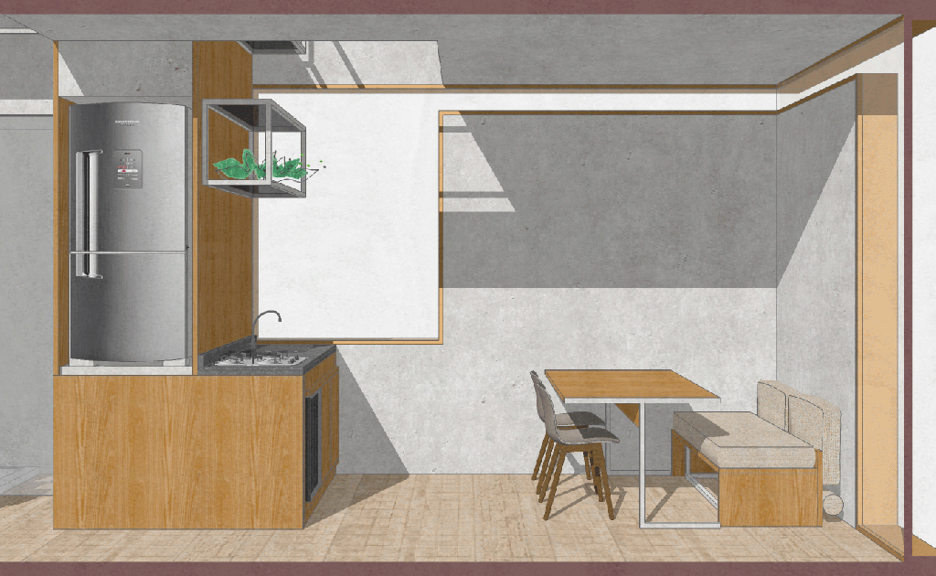 . No espaço residual, gerado pela subtração dos ambientes privados, o uso social foi organizado. Dando espaço para sala de estar e cozinha.