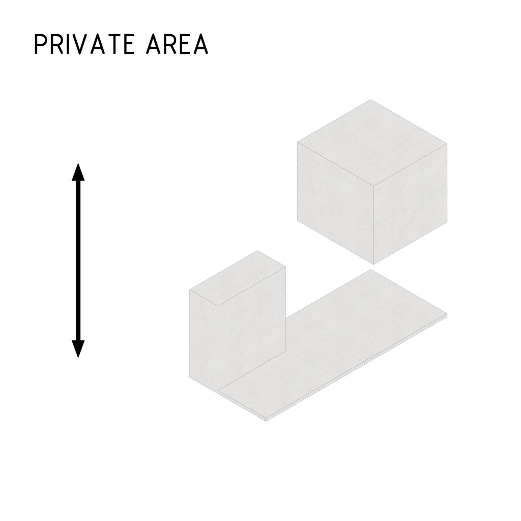 . The remaining space, shaped by the subtraction of the private rooms, was allocated to social areas such as the kitchen and living room.