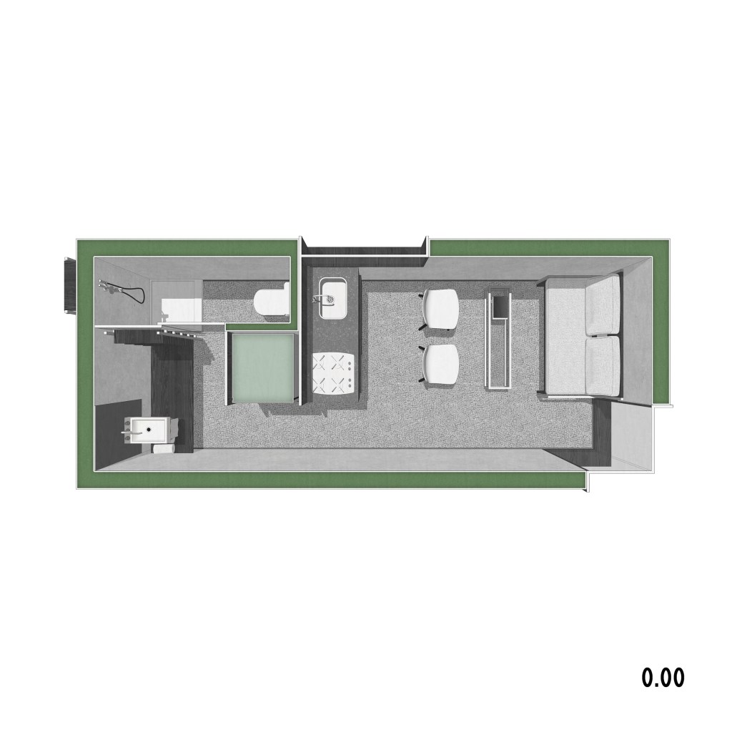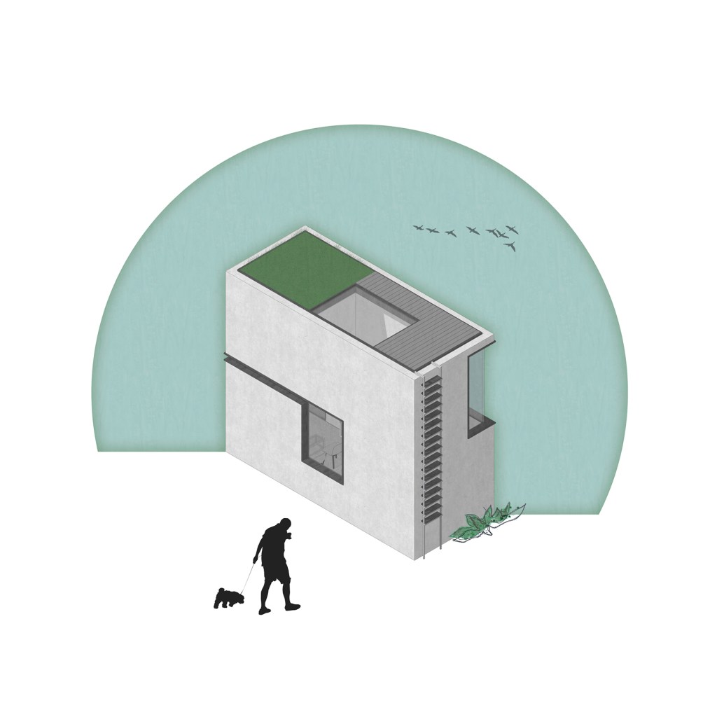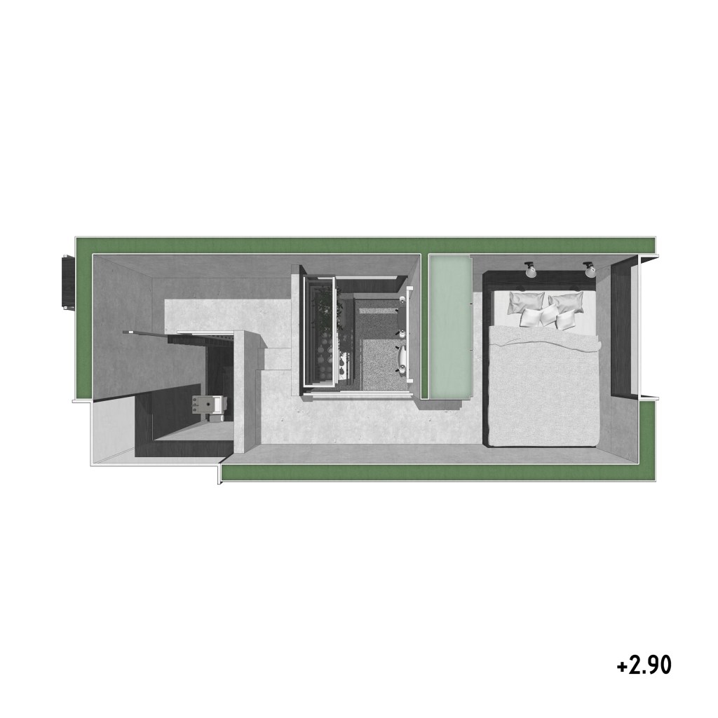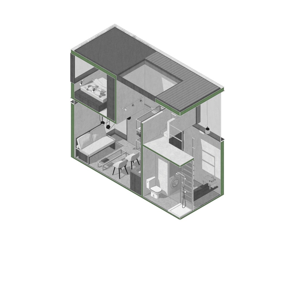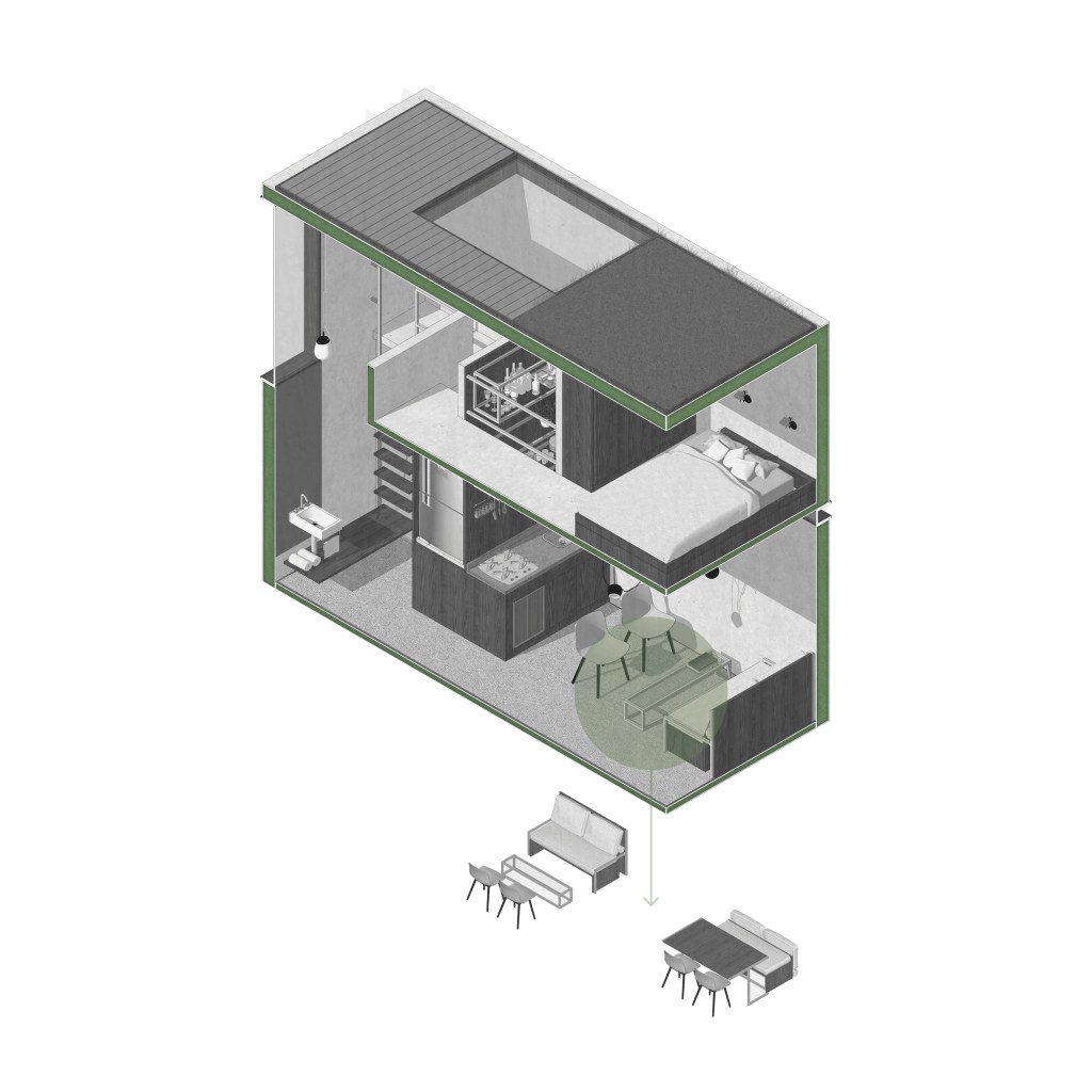 . The challenge of this proposal was to fit the dwelling into a compact space [equivalent to 2 containers].